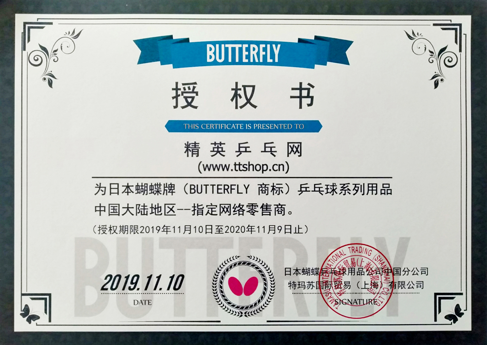 精英乒乓网是“蝴蝶”品牌在中国大陆市场的第一家授权网络经销商,自2010以来,精英乒乓网恪守双方协议约定,坚持做正品“蝴蝶”乒乓器材,为广大球友提供优质的产品和服务。作为“蝴蝶”品牌十年的稳固合作伙伴,精英乒乓网有责任和义务,将为“蝴蝶”品牌在中国大陆市场的宣传推广以及网络营销提供更好的服务。