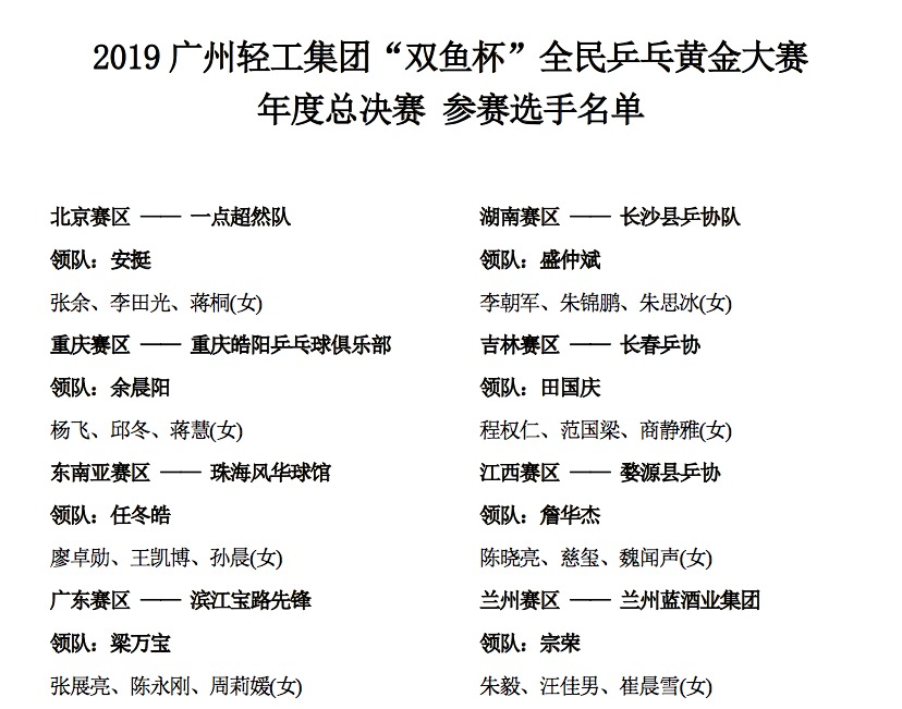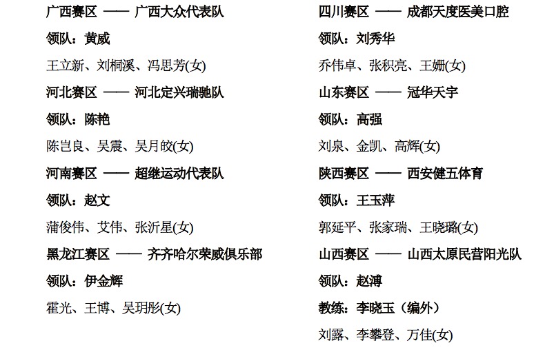 各队伍参赛运动员名单: